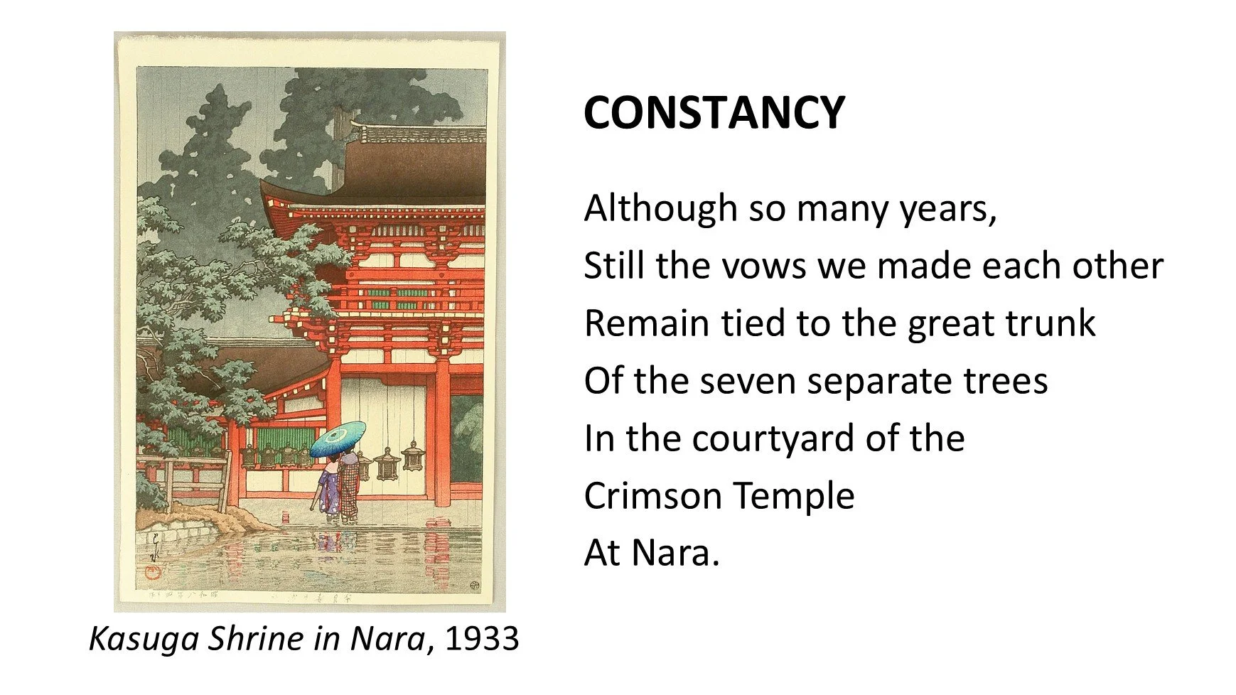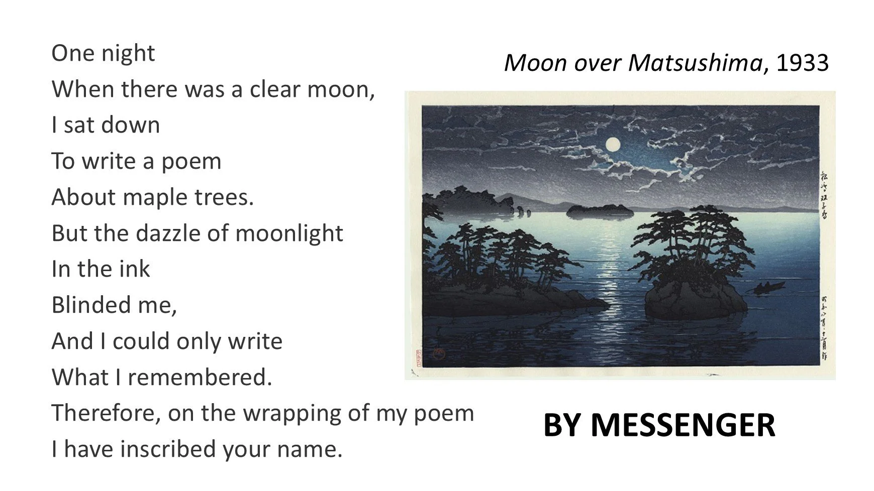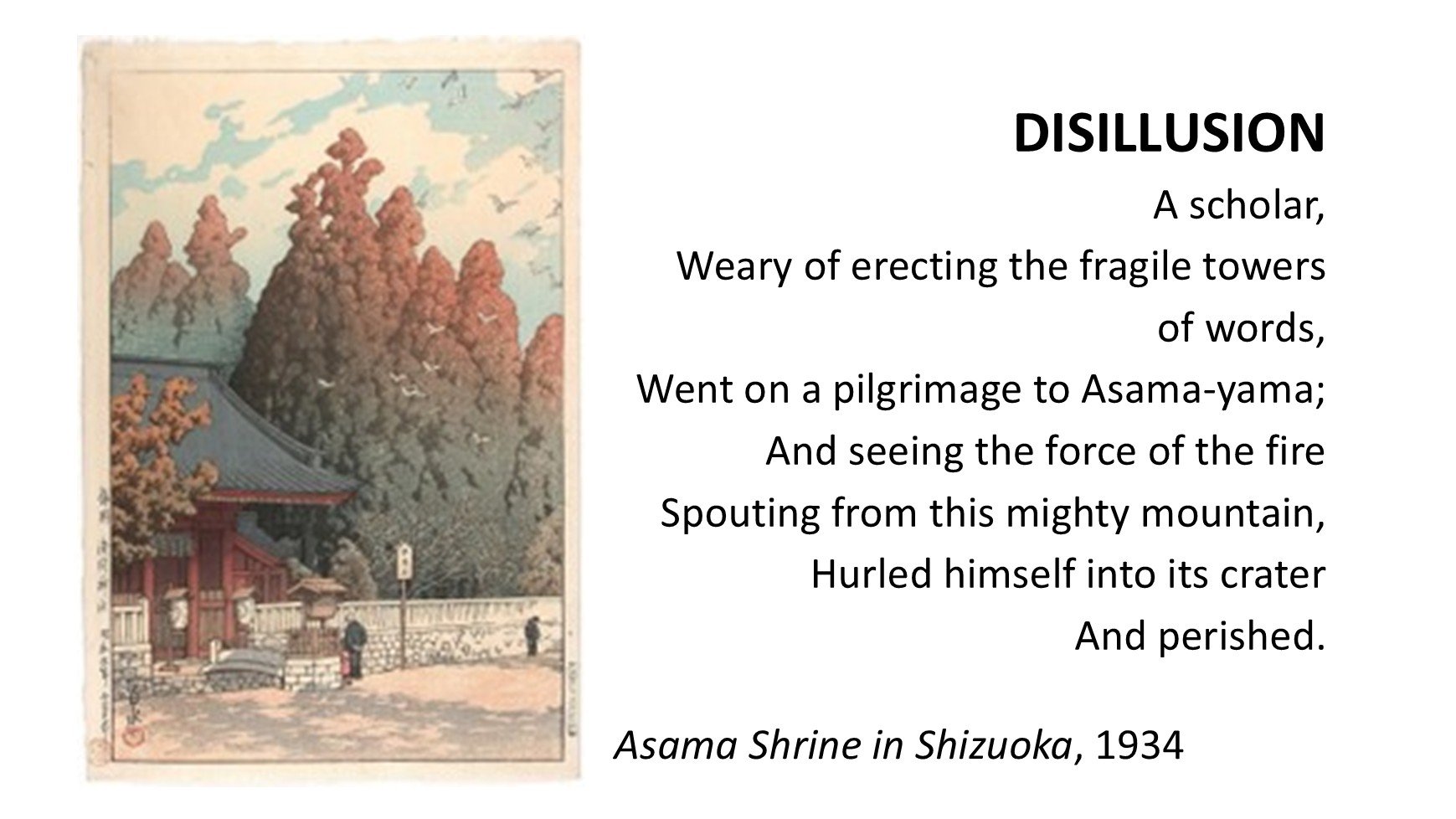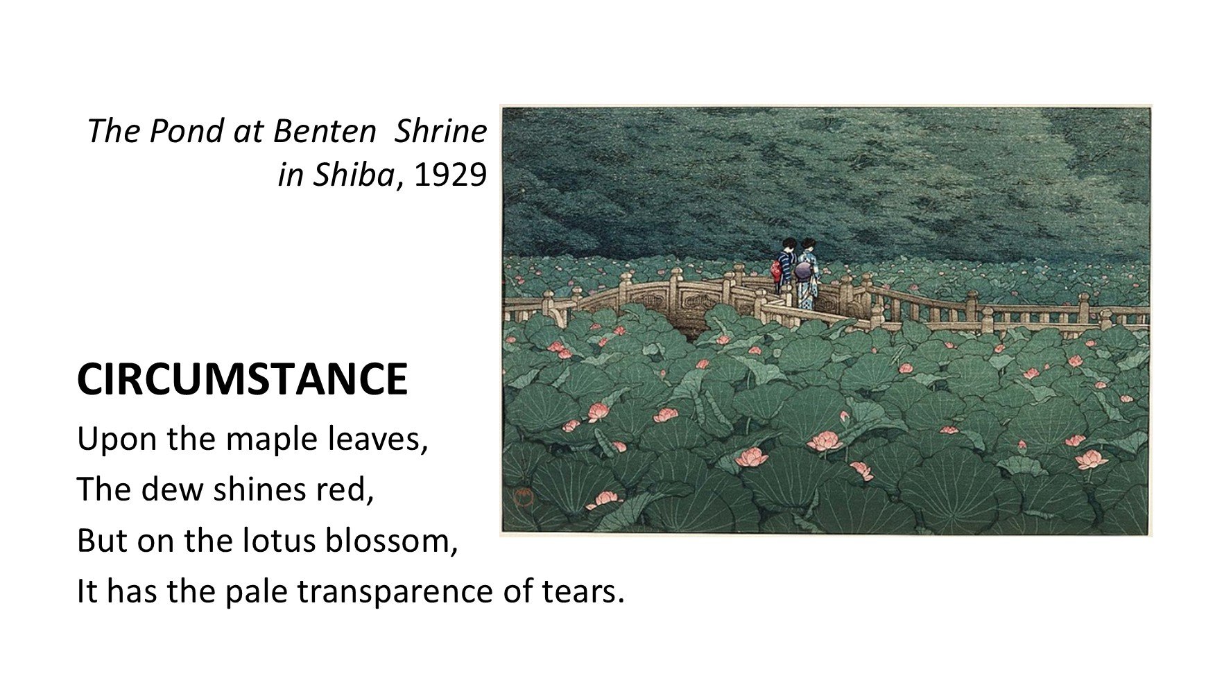 Although I have no evidence that these artists knew each other’s work, I feel that their oeuvres bespeak a shared stylistic and expressive imperative: for East to seek West, and for West to seek East. In my work, Impressions from the Floating World, I have divined this set of miniatures from Hasui’s prints paired with poems by Lowell. My aspiration for each movement was to shine an impossibly bright and distilled light through as small and concentrated a temporal window as possible. To me, these carefully paired prints and poems match so ideally, and so seamlessly, that I can scarcely believe they were conceived and produced in isolation from one another, and by two different people no less. - Matthew Shorten